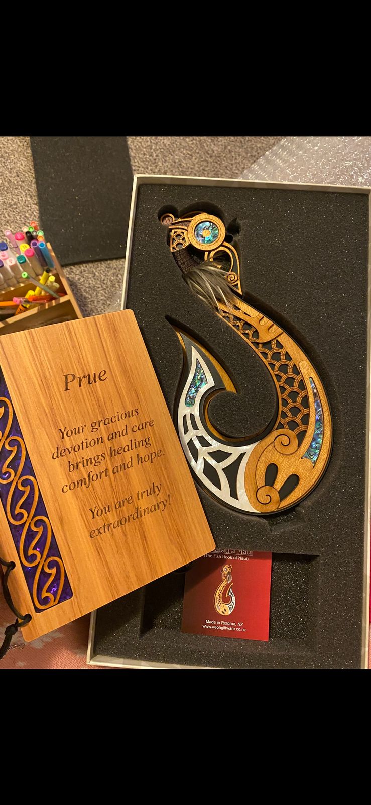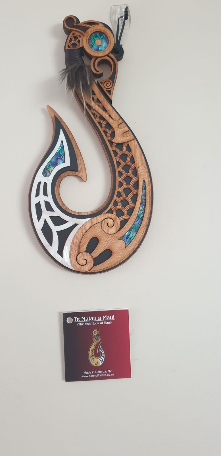 This piece of art boasts super fine detail, paua inlay and comes complete with wall mount, related story and protective box (Overall height 275mm)