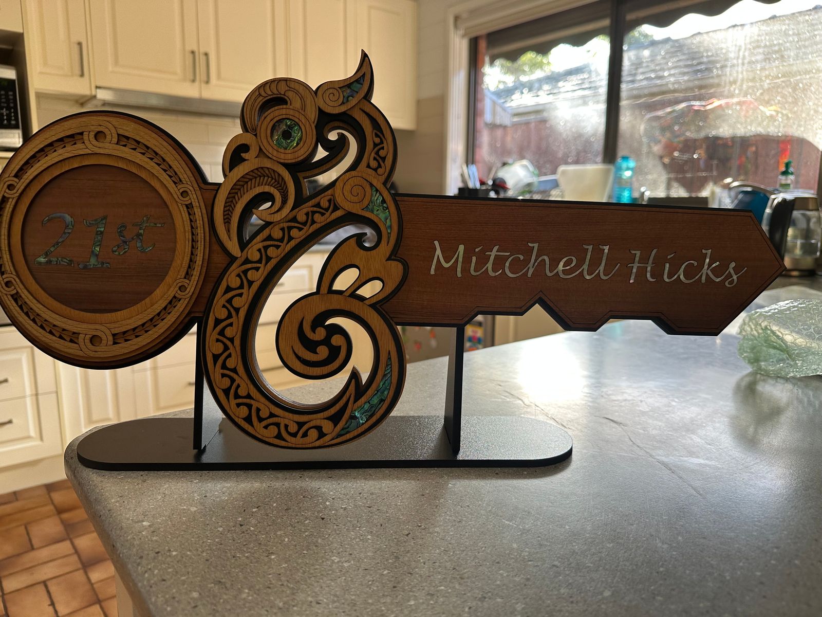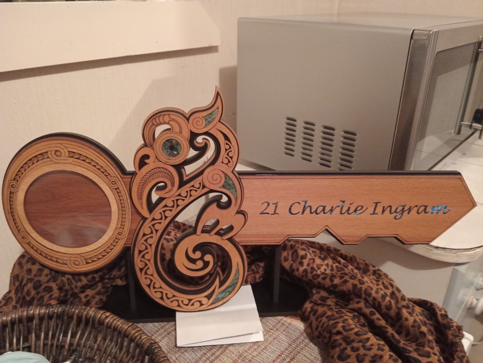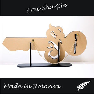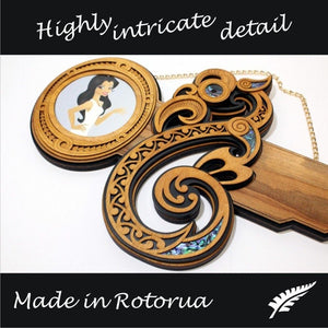 This artwork is an impressive contemporary representation of the typical form of Te Manaia. The key is crafted from recycled Native New Zealand Rimu veneerboard, medium density fibreboard (mdf), Gaboon veneer plywood and embellished with NZ Paua shell.