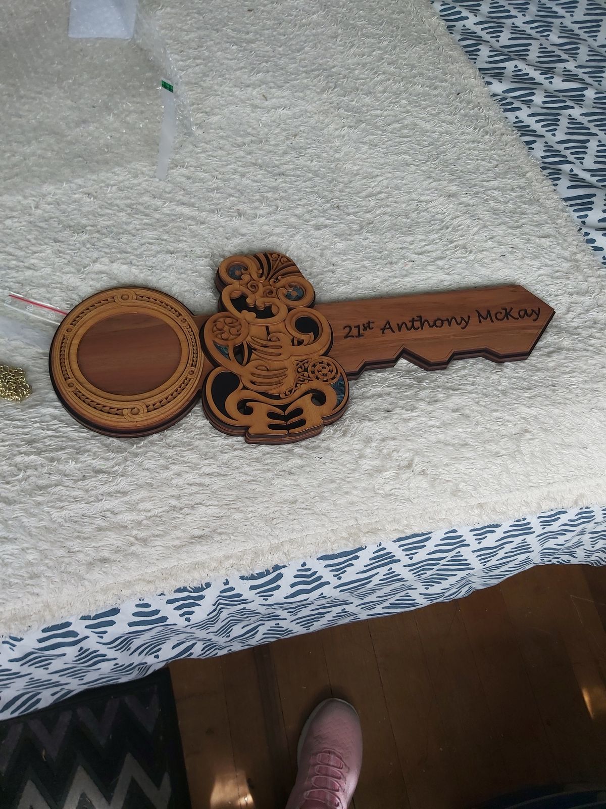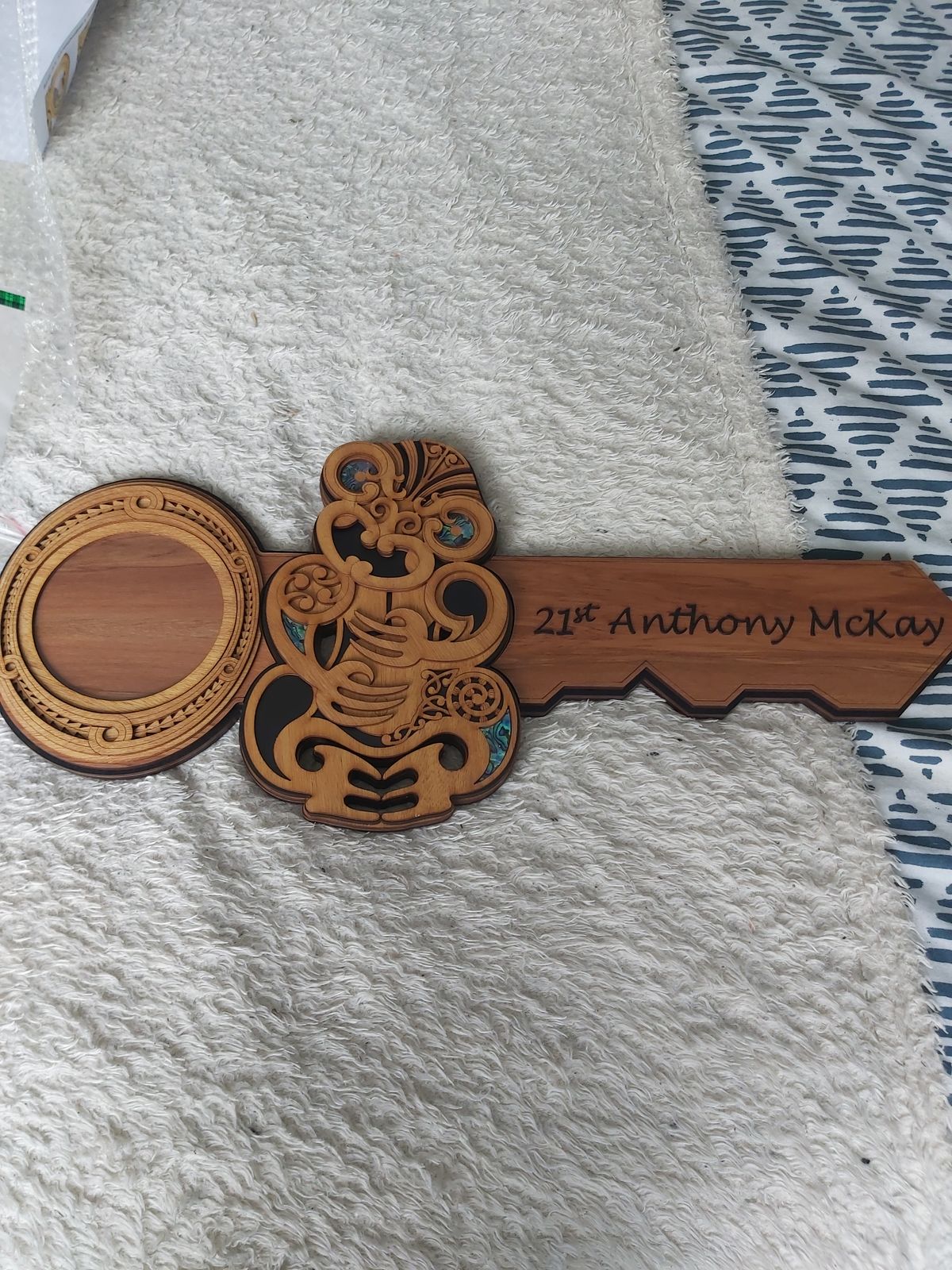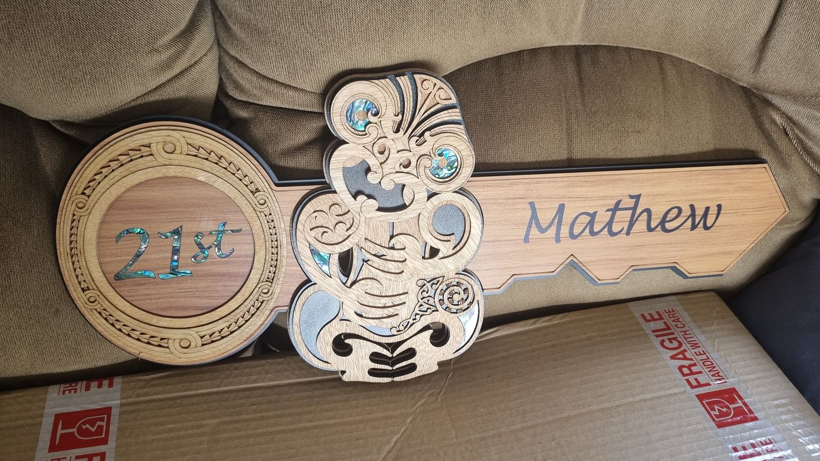 This artwork with its intricate design is an impressive contemporary representation of Hei-Tiki. The key is crafted from recycled Native New Zealand Rimu veneerboard, medium density fibreboard (mdf), Gaboon veneer plywood and embellished with NZ Paua & Mother of Pearl laminate.