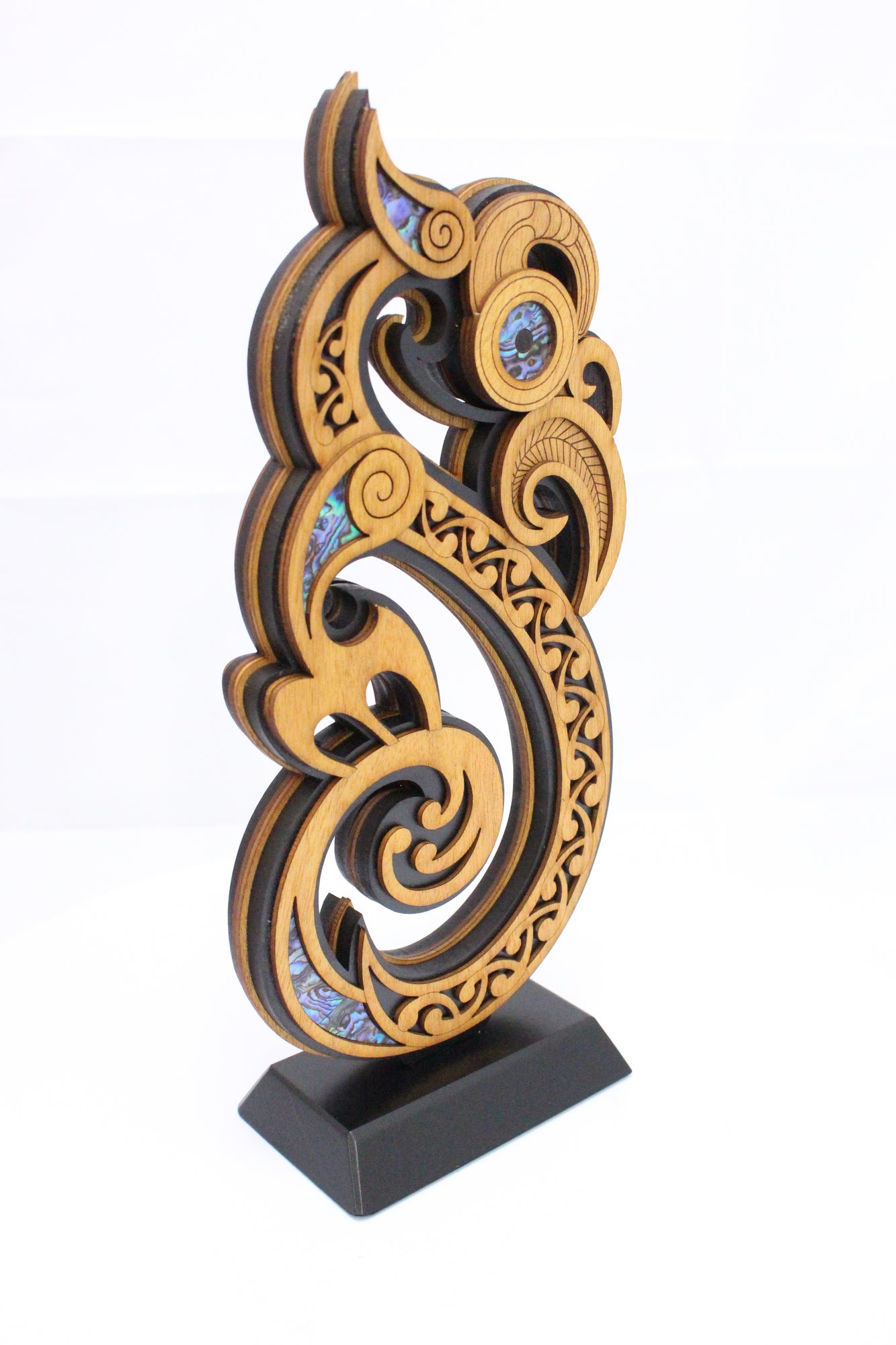 Large double-sided Manaia Trophy (310mm high) crafted from plantation grown gaboon using laser technology and hand-assembled. This piece of art boasts super fine detail, paua inlay and comes complete with wall mount, related story and protective box.