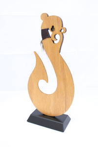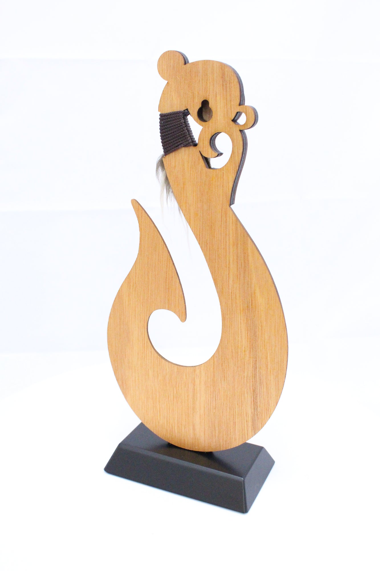Large Standing Hook artwork (300mm high) crafted from plantation grown gaboon using laser technology and hand-assembled. It is a contemporary representation of Te Matau a Maui.
