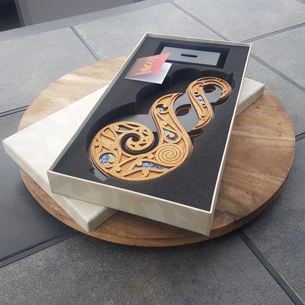 The large standing twist artwork (300mm high) is a contemporary representation of the Pikorua (Twist). This single-sided piece of art boasts super fine detail, paua inlay and comes complete with stylish black base, related story and protective box.
